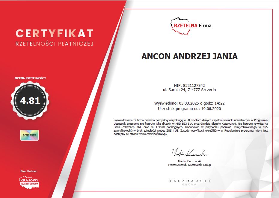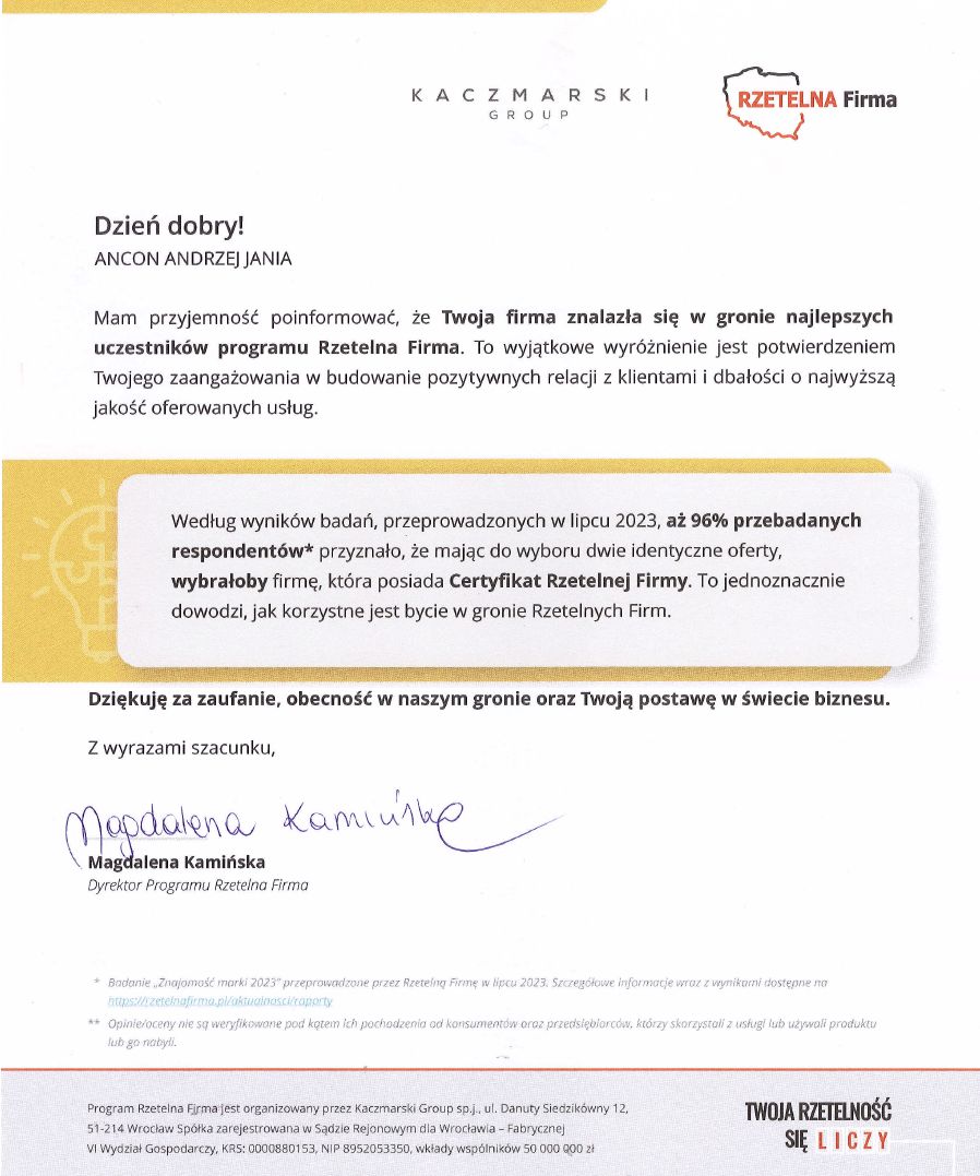 Szanowny Kliencie, Certyfikaty aktualne na dzień bieżący uzyskasz klikając na