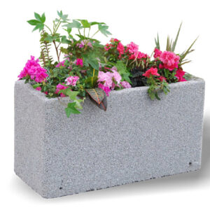Donica betonowa o prostokątnym kształcie. Kwietnik ten cechuje się estetycznym wyglądem. Betonowy kwietnik ze względu na swoją masywną konstrukcje może również pełnić funkcje ograniczenia dostępu samochodom.
