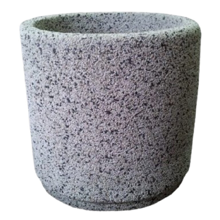 Kwietnik betonowy zrobiony z płukanego betonu na bazie kruszyw naturalnych. Kwietnik ten ma okrągły kształt.