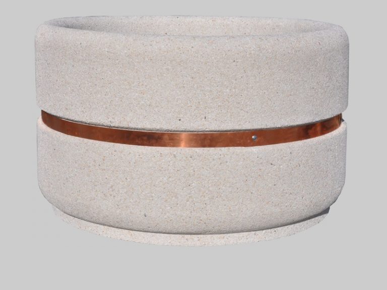 Kwietnik betonowy zrobiony z płukanego betonu na bazie kruszyw naturalnych. Kwietnik ten ma okrągły kształt i otacza go miedziany bądź wykonany z blachy nierdzewnej pas.
