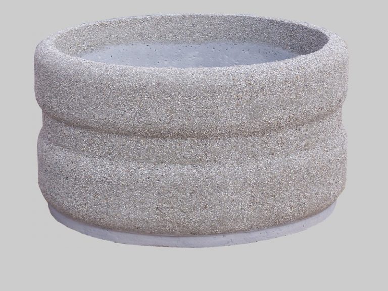 Kwietnik betonowy zrobiony z płukanego betonu na bazie kruszyw naturalnych. Kwietnik ten ma okrągły kształt.