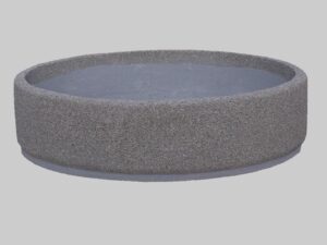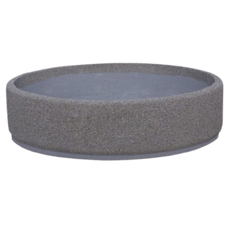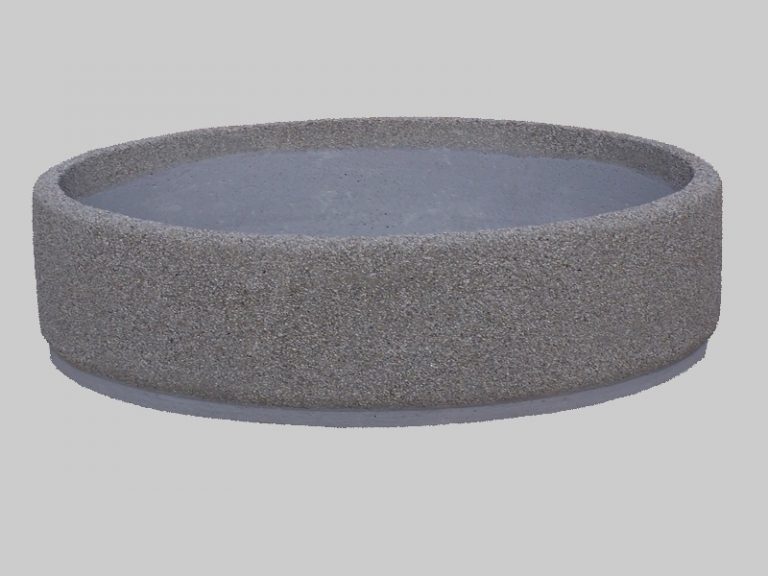 Kwietnik betonowy zrobiony z płukanego betonu na bazie kruszyw naturalnych. Kwietnik ten ma okrągły kształt.