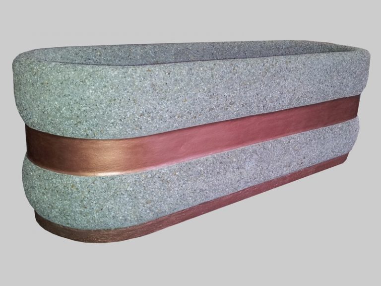 Kwietnik betonowy zrobiony z płukanego betonu na bazie kruszyw naturalnych. Kwietnik ten ma owalny kształt i otacza go malowany pas.