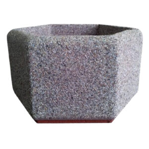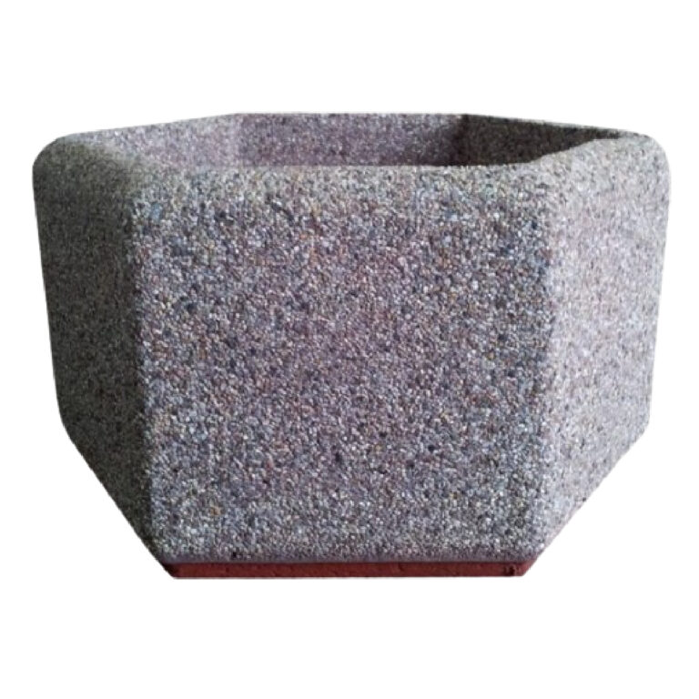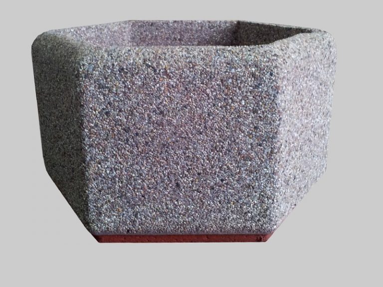 Kwietnik betonowy zrobiony z płukanego betonu na bazie kruszyw naturalnych. Kwietnik ten ma kształt sześcioboku.
