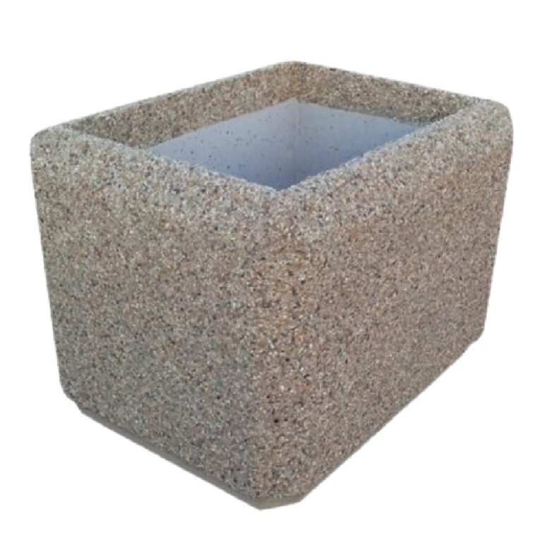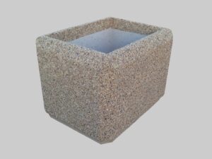 Kwietnik betonowy zrobiony z płukanego betonu na bazie kruszyw naturalnych. Kwietnik ten ma kształt prostokąta.