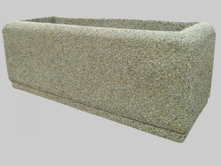 Kwietnik betonowy zrobiony z płukanego betonu na bazie kruszyw naturalnych. Kwietnik ten ma kształt prostokąta.
