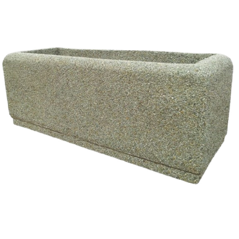 Kwietnik betonowy zrobiony z  płukanego betonu na bazie kruszyw naturalnych. Kwietnik ten ma kształt prostokąta.