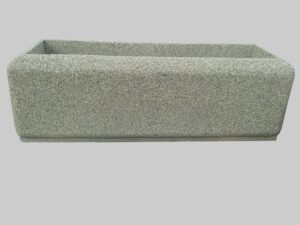 Kwietnik betonowy zrobiony z płukanego betonu na bazie kruszyw naturalnych. Kwietnik ten ma kształt prostokąta.