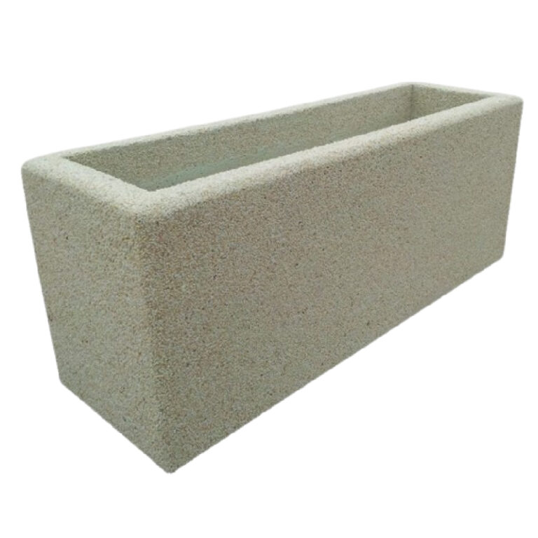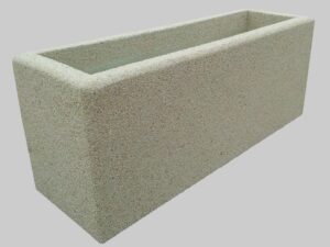 Kwietnik betonowy zrobiony z płukanego betonu na bazie kruszyw naturalnych. Kwietnik ten ma kształt prostokąta.