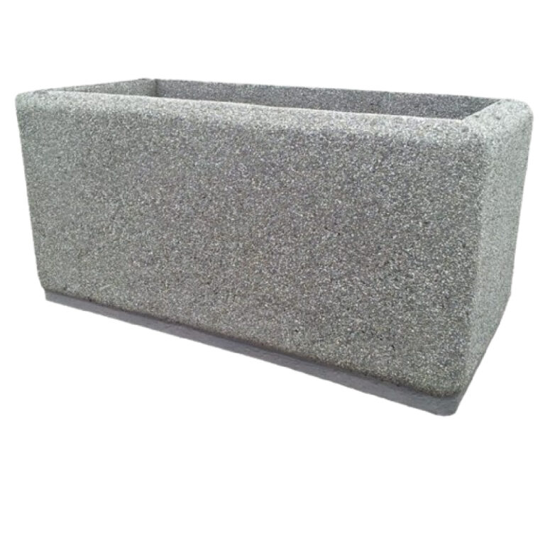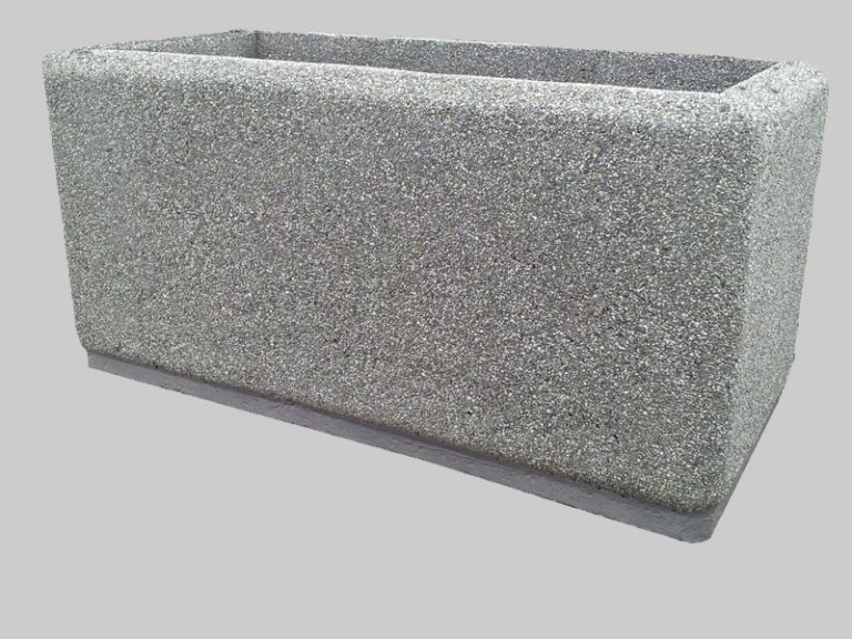 Kwietnik betonowy zrobiony z  płukanego betonu na bazie kruszyw naturalnych. Kwietnik ten ma kształt prostokąta.