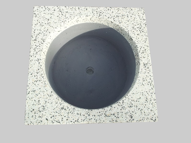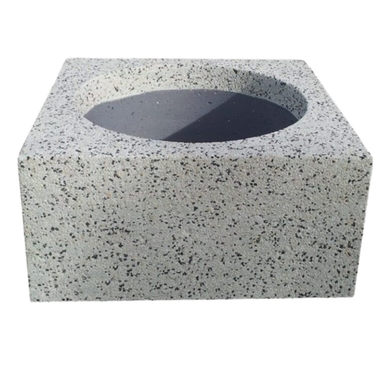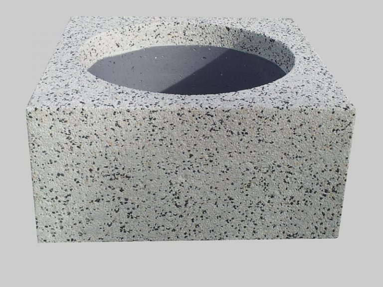 Kwietnik betonowy zrobiony z płukanego betonu na bazie kruszyw naturalnych. Kwietnik ten ma kształt kwadratu.