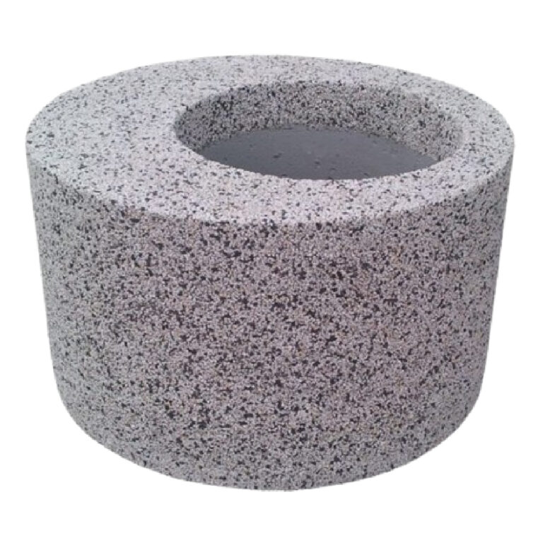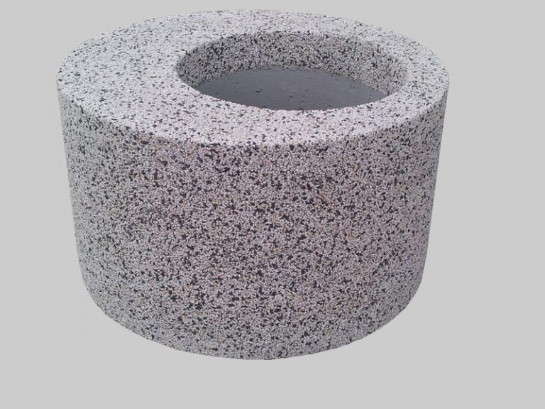 Kwietnik betonowy zrobiony z  płukanego betonu na bazie kruszyw naturalnych. Kwietnik ten ma okrągły kształt. Otwór w donicy ma wymiary: Ø 45×40 cm.