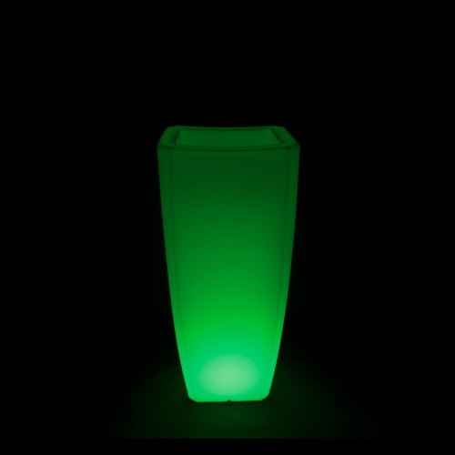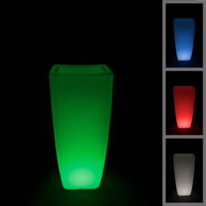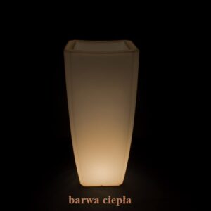 Nowoczesna podświetlana donica wykonana z tworzywa. Dzięki zastosowaniu jakościowo najlepszych materiałów produkt jest trwały oraz odporny na działania warunków atmosferycznych. Zastosowanie oświetlenia LED wewnątrz zapewnia ciekawą, estetyczną oraz energooszczędną ozdobę świetnie wpasowującą się zarówno w zieleń tarasu oraz ogród, jak i hole nowoczesnych budynków użytku publicznego. Produkt łączy w sobie dwie funkcję – eleganckiej ozdobnej donicy oraz oświetlenia pozostawiającego półmrok tworząc tym samym charakterystyczną pozytywną atmosferę mogącą wspierać tarasy domów weselnych lub hotelowe lobby.