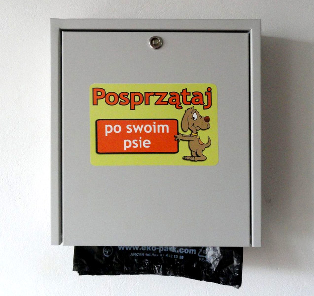 – opis na froncie informuje o przeznaczeniu dystrybutora i mobilizuje do sprzątania po psach,