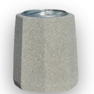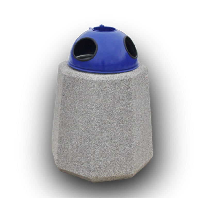 Kosz betonowy o podstawie ośmiokąta, wraz z kopułą zabezpieczającą przed opadami deszczu.