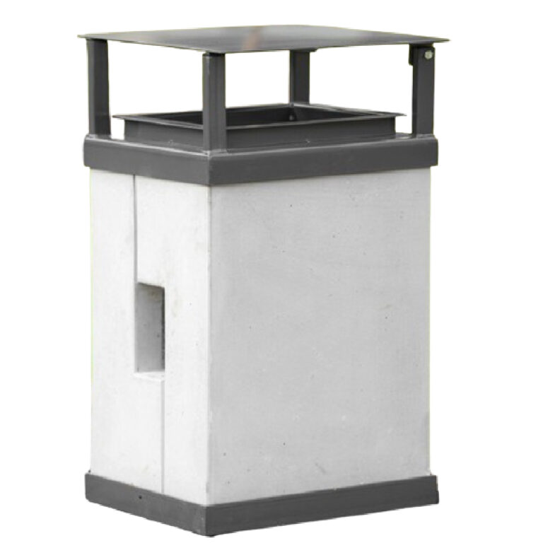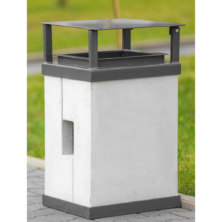 Kosz KT061 Bis D to nowa odsłona znanego i lubianego kosza KT061. Wykonany z gładkiego betonu architektonicznego, dodatkowo wykończony elementami stalowymi w postaci okalającego kołnierza i daszka.