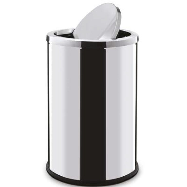 Okrągły kosz na śmieci ze stali nierdzewnej z pokrywą obrotową.
