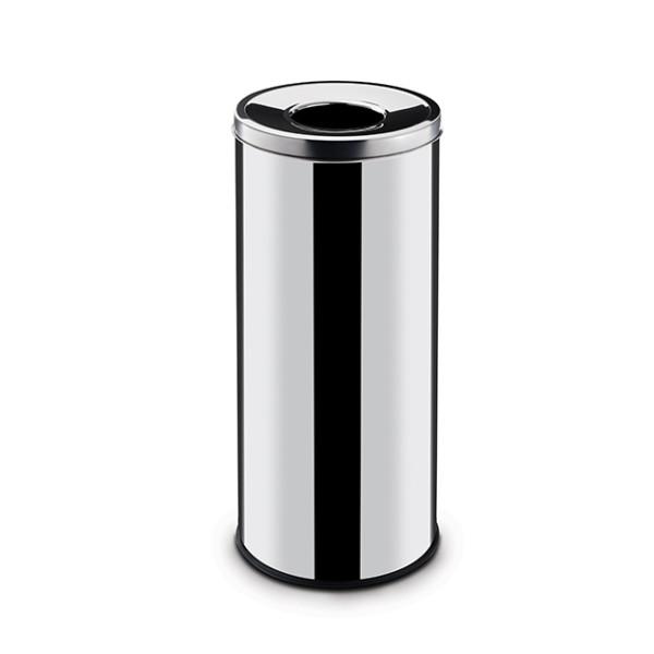 Okrągły kosz wykonany polerowanej stali nierdzewnej. Kosz na odpady tego typu sprawdza się zarówno wewnątrz jak i na zewnątrz budynków.
