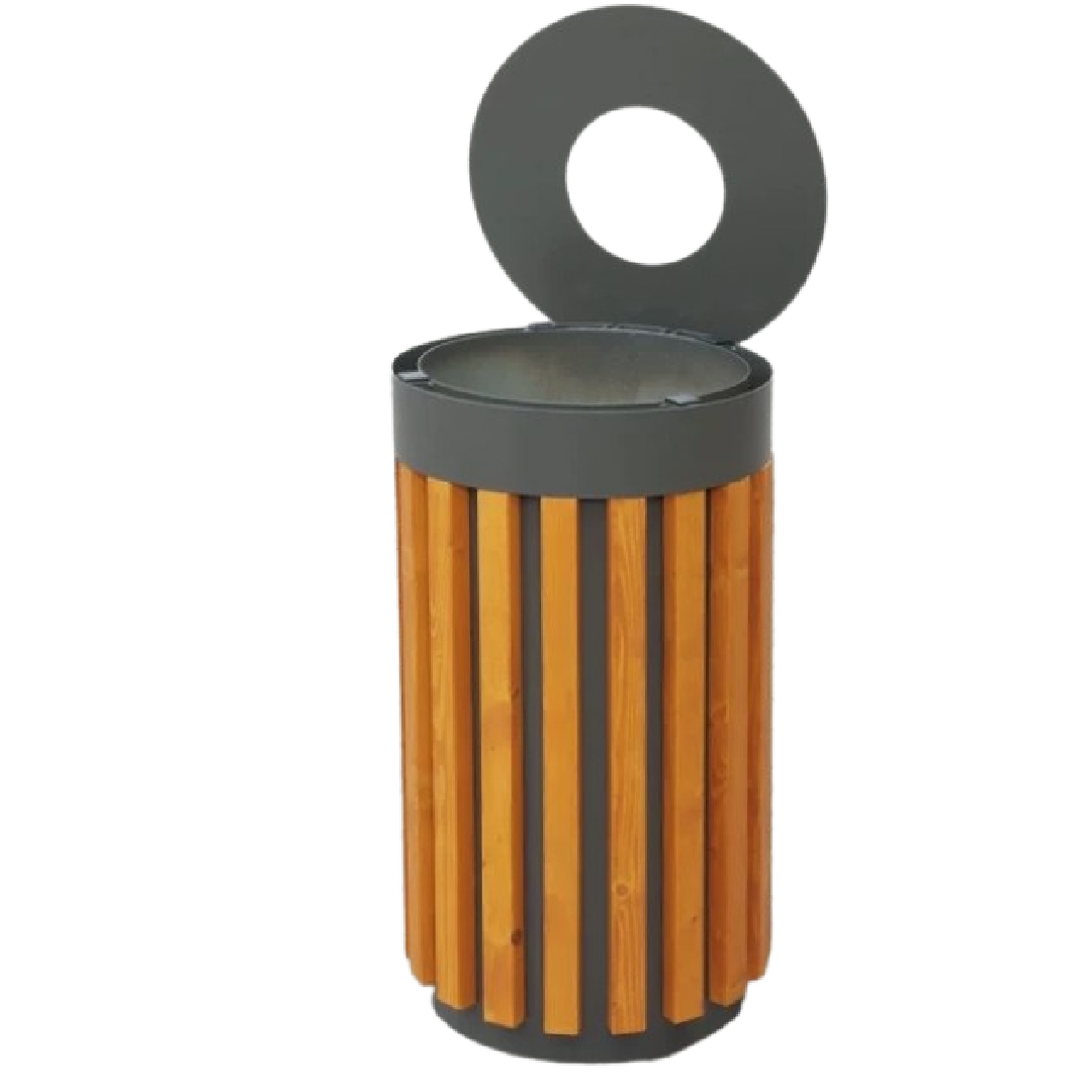 Kosz na śmieci KU001 – nowoczesny kosz stalowo-drewniany do przestrzeni publicznych