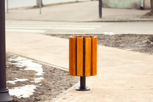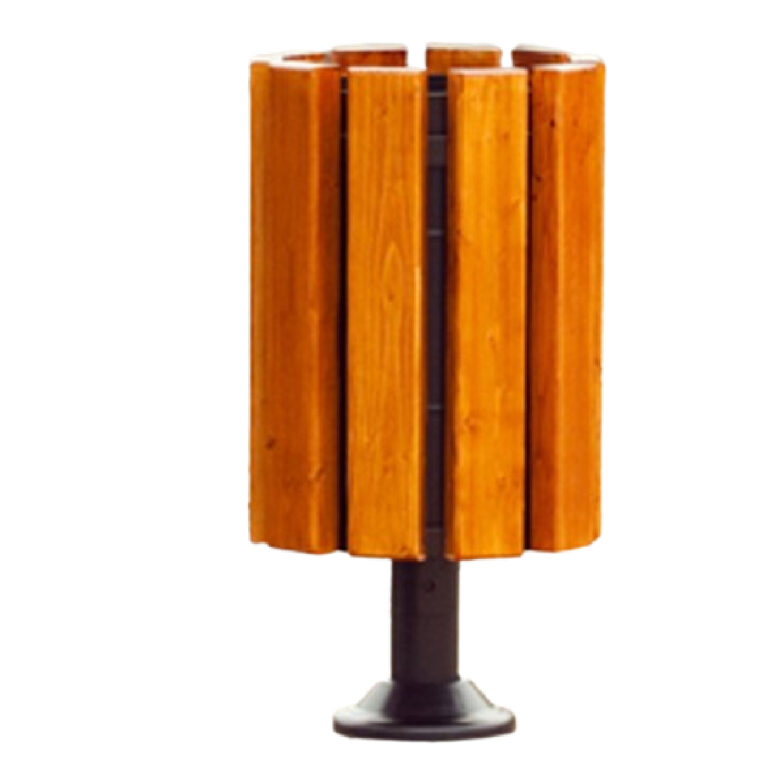- kosz parkowy na słupku z rury grubościennej zakończonej trzema prętami, stelaż stalowy obudowanym elementami z drewna impregnowanego, lakierowanego (kolor lakieru do uzgodnienia),