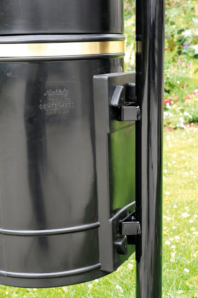 – kosz miejski zamykany na klucz trójkątny, zamek kosza automatycznie blokuje się po odstawieniu pojemnika w odpowiednią pozycje,