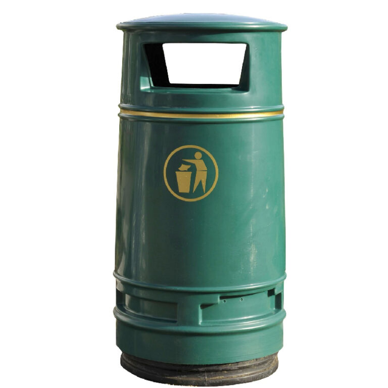 Kosz na odpady zrobiony z polietylenu nieodkształcającego się. W celu zwiększenia odporności na opady pojemnik został poddany obróbce anty-UV.