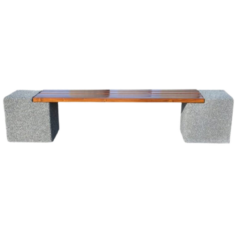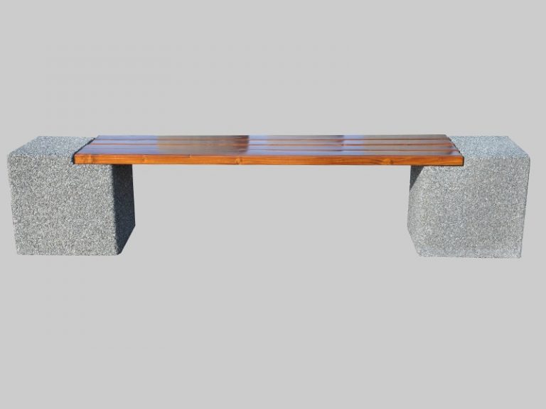 Ławka parkowa, wykonana z betonowej podstawy i drewnianego siedziska. Ławka miejska tego typu świetnie komponuje się w parkach i na innych terenach zielonych.
