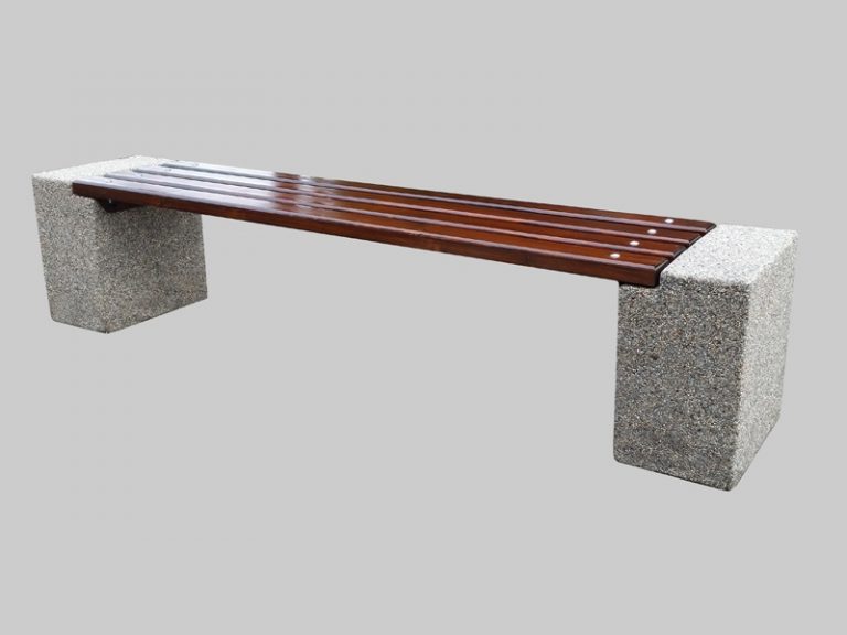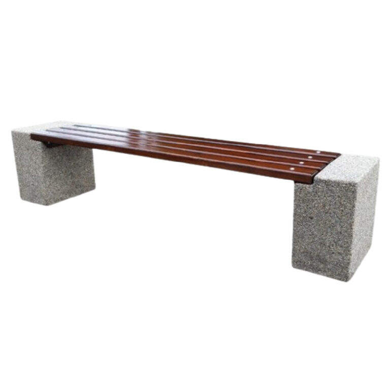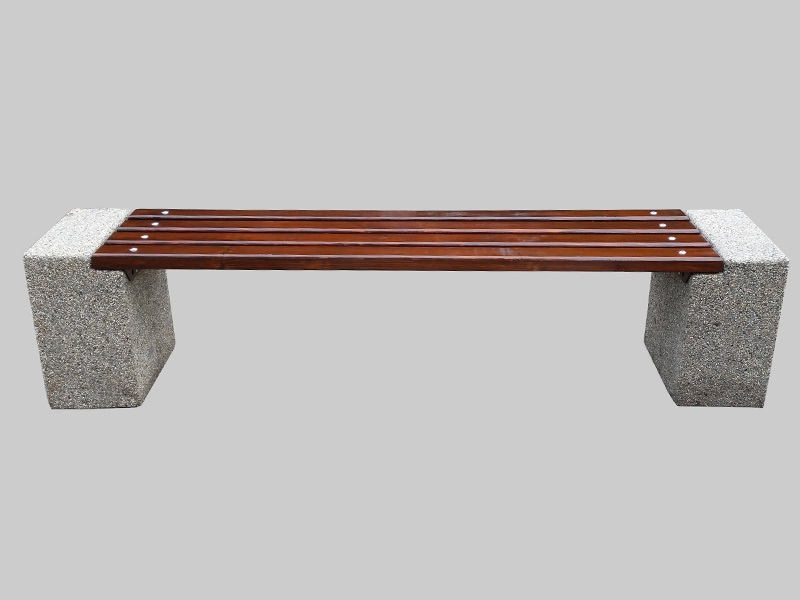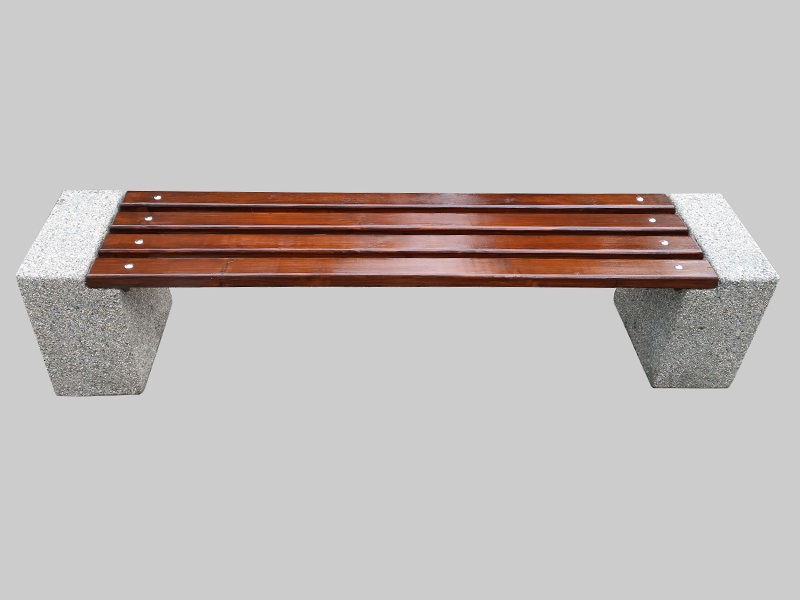 Ławka parkowa, wykonana z betonowej podstawy i drewnianego siedziska. Ławka miejska tego typu świetnie komponuje się w parkach i na innych terenach zielonych.