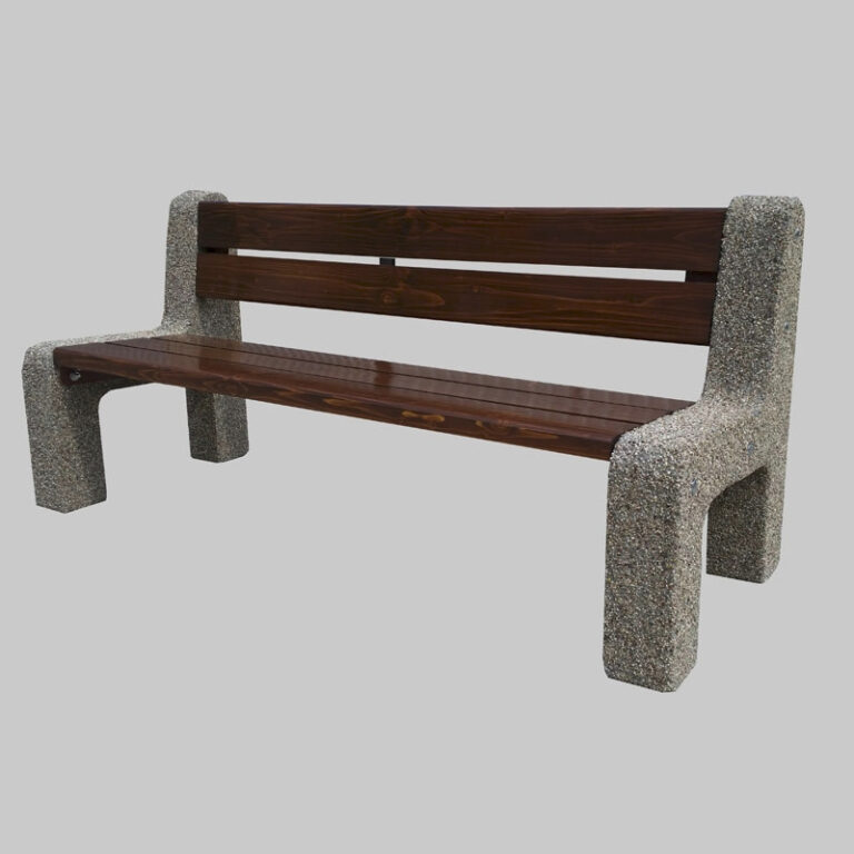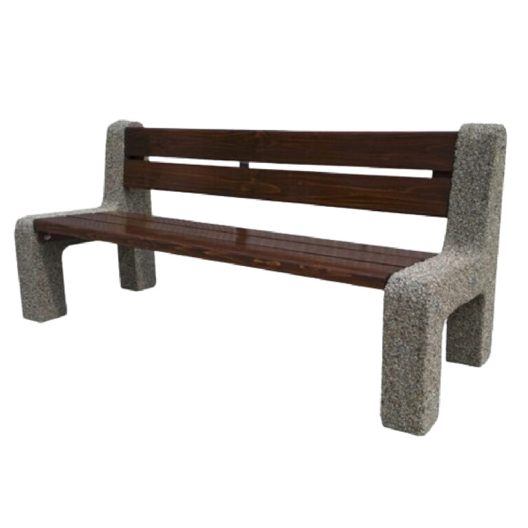 Ławka z oparciem. Wersja do postawienia. Możliwość zakotwienia do podłoża za pomocą metalowej lub prefabrykowanej betonowej kotwy. Podstawa ławki betonowa wykonana w technologii „odkrytych kruszyw”. Siedzisko ławki standardowo wykonane z drewna iglastego. Drewno pokryte dwoma warstwami lakierobejcy oraz dodatkowo zabezpieczone dwoma warstwami lakieru.