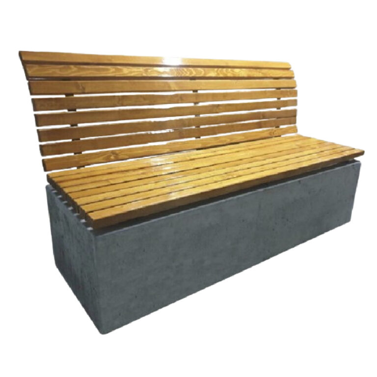 Ławka o podstawie betonowej. Siedzisko z oparciem. Ze względu na wymiary oraz wagę nie ma konieczności kotwienia do podłoża. Siedzisko o charakterystycznym kształcie oraz gęsto osadzonymi listwami sprawia, że ławka jest bardzo wygodna i nadaje się do zagospodarowania każdej przestrzeni publicznej.