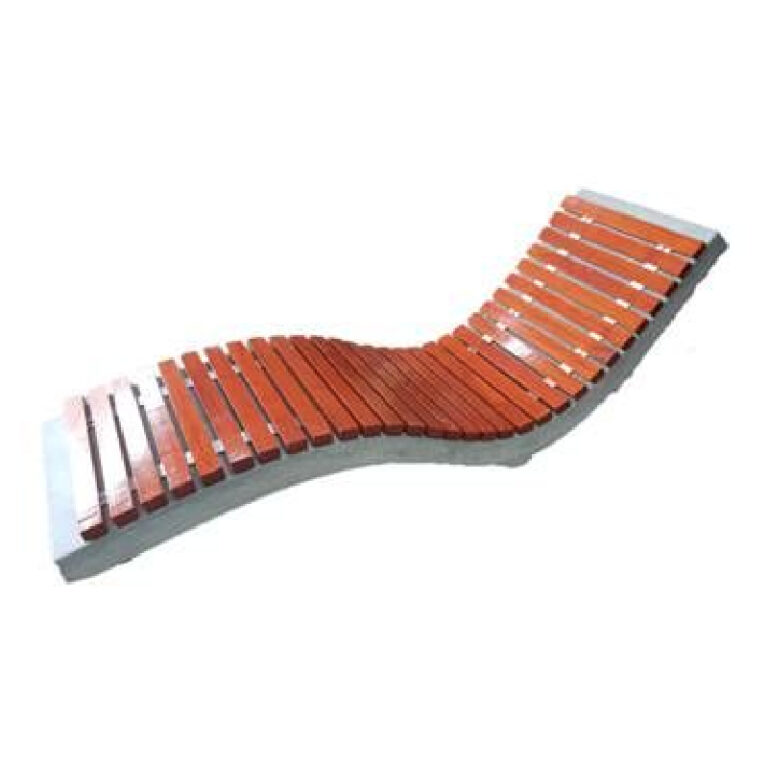 Doskonały leżak miejski, wykonany z betonu płukanego zbrojonego z dodatkiem listew drewnianych lakierownych.