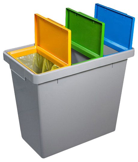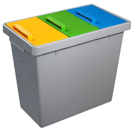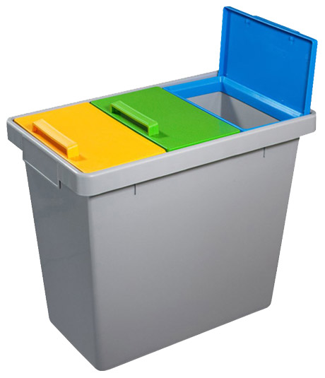 Pojemnik do segregacji z trzema przegrodami, które odróżnia kolor pokrywki. Idealny do zbiórki papierów, szkła, czy plastiku. Nadaje się do ustawienia w pomieszczeniach, np. mieszkaniach, biurach, szkołach itp. Segregacja śmieci jest już niemalże nieodłączną częścią gospodarki odpadami. Warto więc zaopatrzyć się w pojemniki do segregacji.
