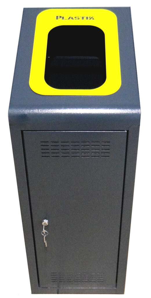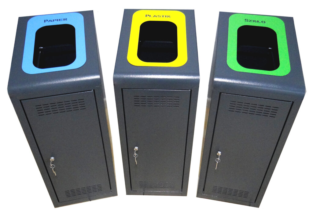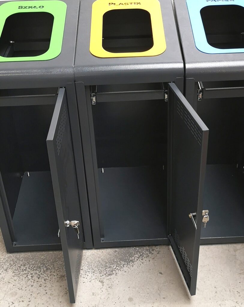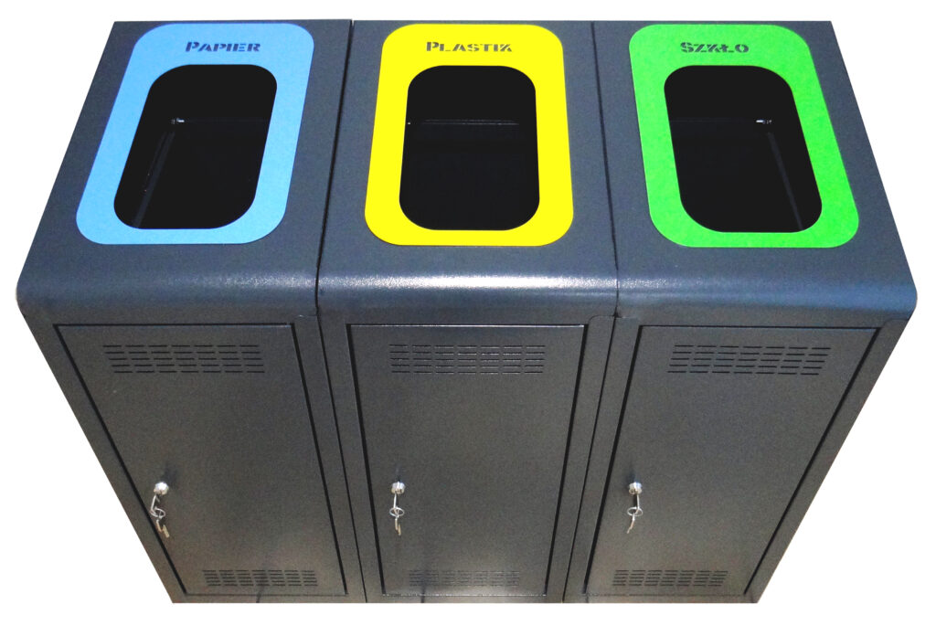 Bardzo solidnie wykonany pojemnik przeznaczony do wyposażenia wnętrz lub innych powierzchni zadaszonych. Wykonany z blachy stalowej z zastosowaniem pod worki foliowe na śmieci. Może być wykonany jako pojedynczy kosz lub zestaw pojemników połączonych modułowo. Zdjęcie ilustruje zestaw 3 pojemników.