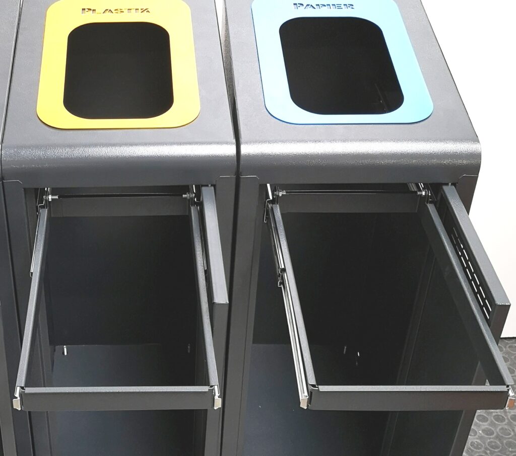 – wyposażony w prowadnice na łożyskach kulkowych do zamocowanie worków wewnątrz. Przy ich opróżnianiu prowadnice zapewniają pełne wysunięcie wypełnionego odpadami worka z korpusu pojemnika,
