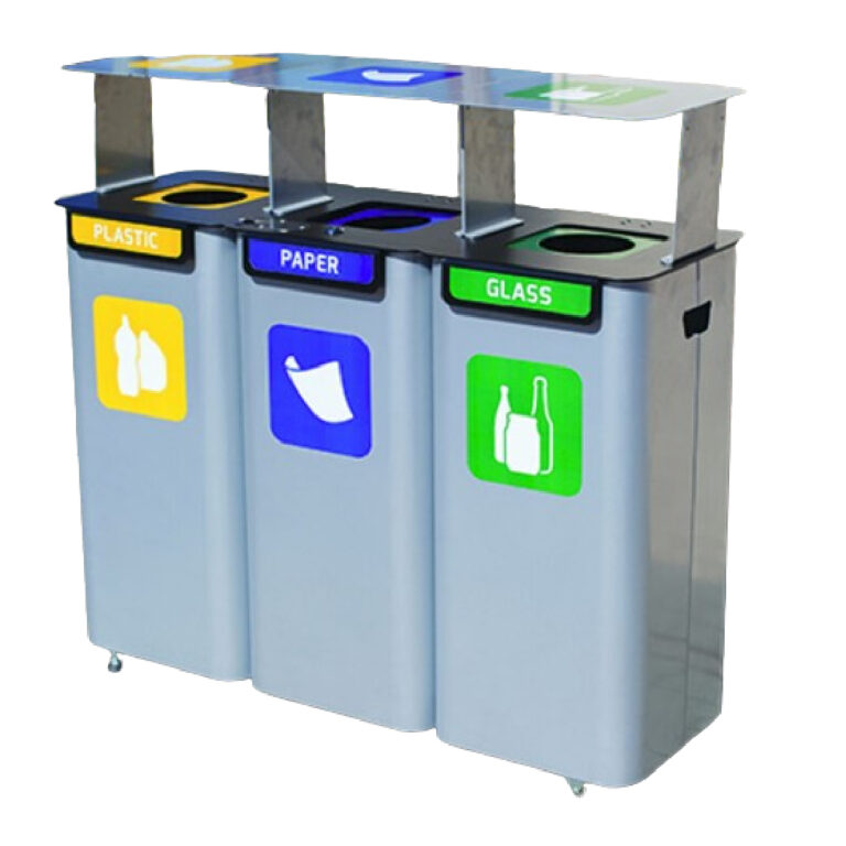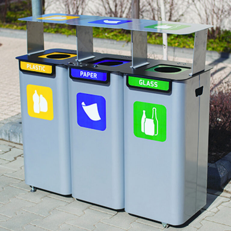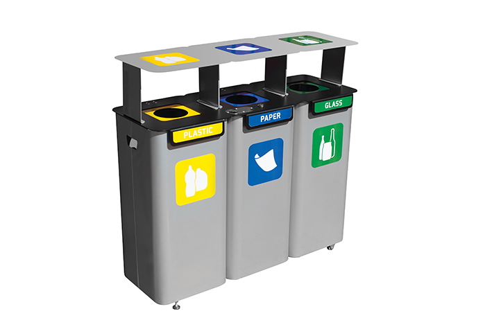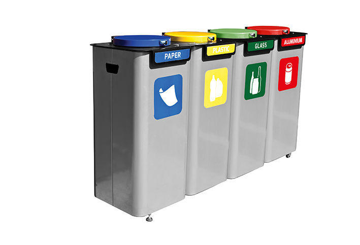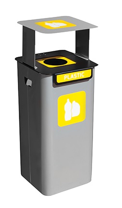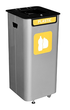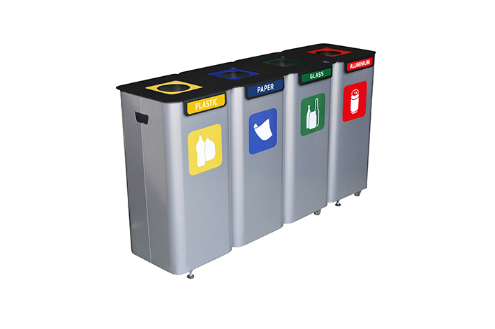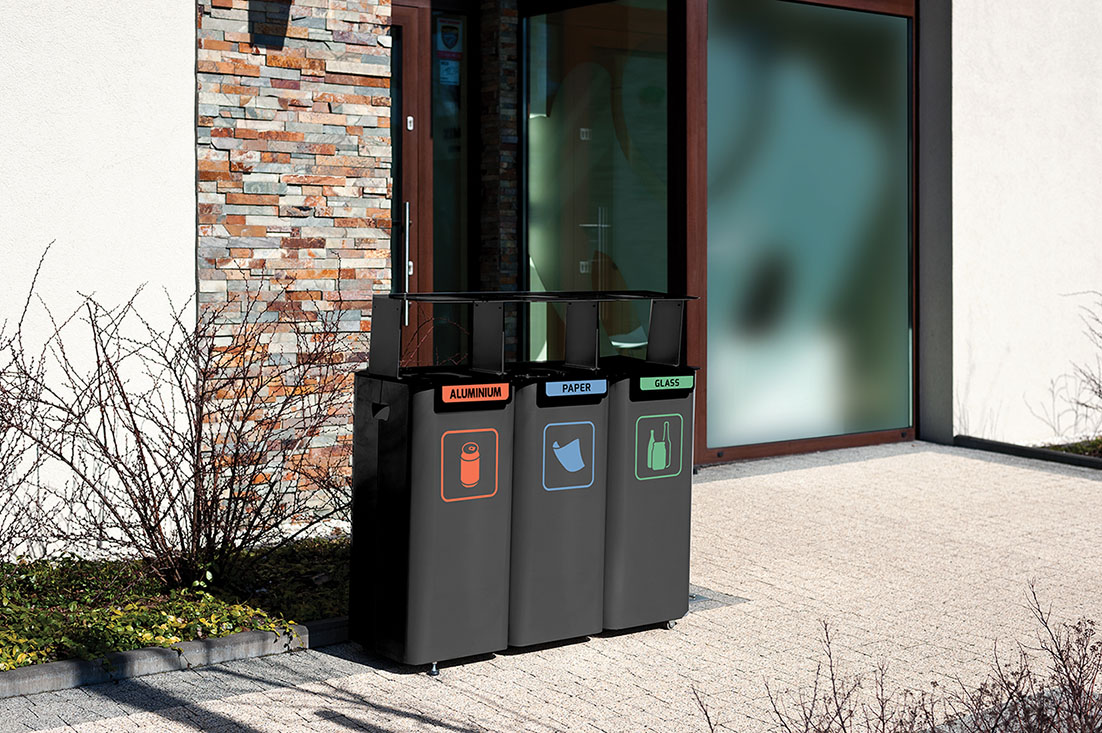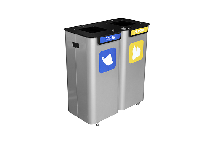 Stalowy kosz modułowy na odpady. Kosz do selektywnej zbiórki odpadów, który ma możliwość go łączenia w szereg z innymi koszami tego typu. Wszystkie kosze tego typu mają naklejkę z informacją do jakich odpadów jest przeznaczony.