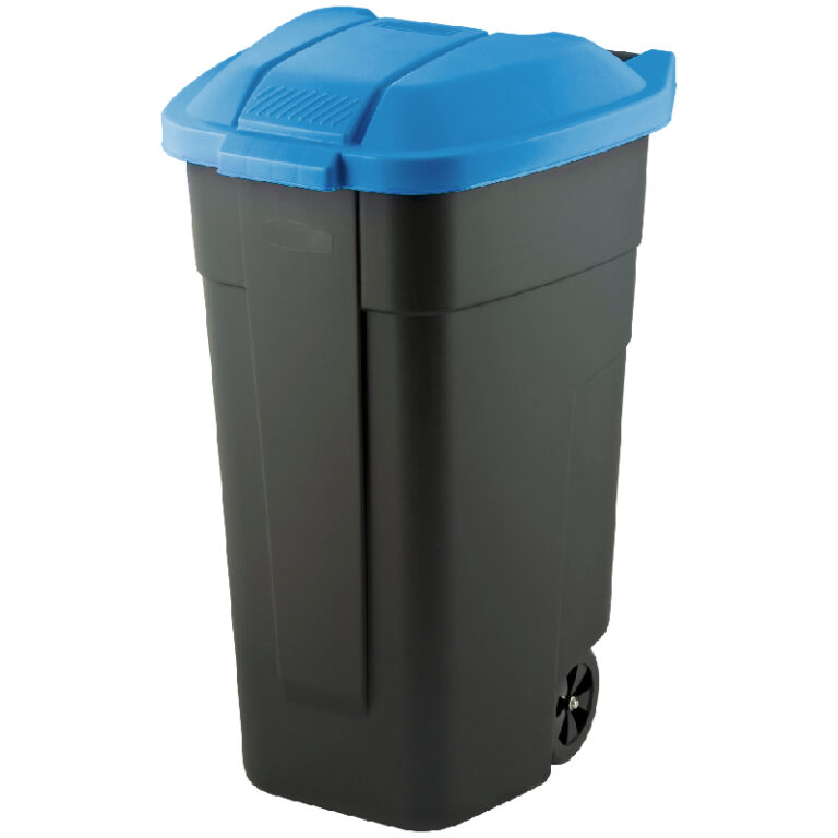 Pojemnik na odpady o pojemności 110 litrów, kolorowe pokrywy ułatwiają rozpoznawanie przeznaczenia segregacyjnego kosza. dodatkowo istnieje możliwość zamówienia etykiet informujących o składowanym odpadzie. Pojemnik ten wyposażony został w kółko do łatwiejszego przemieszczania.