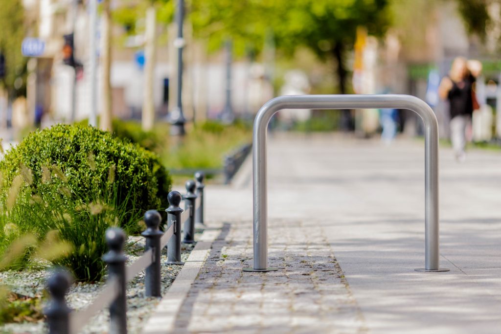 Stojak rowerowy typu U w wersji SR007 nabiera eleganckiego wyglądu, charakterystycznego dla miejskich ścieżek rowerowych. Dodatkowym jego atutem są dwa miejsca na loga bądź napisy.
