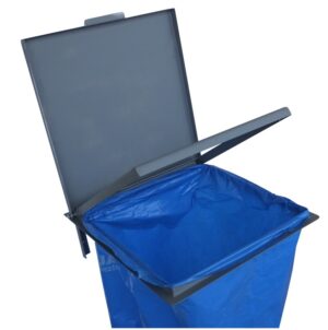 Stojak umożliwiający zastosowanie worków 120 litrów wyposażony w system ułatwiający otwieranie klapy. System uruchamiany jest poprzez przyciśnięcie przycisku znajdującego się przed klapą. Następnie klapa samoczynnie podnosi się do góry i umożliwia wyrzucenie śmieci bez konieczności przytrzymywania pokrywy. takie rozwiązanie podnosi komfort użytkowania oraz higienę. Dolna półka wpływa pozytywnie na stabilność konstrukcji produktu oraz uniemożliwia przetarcie worka.