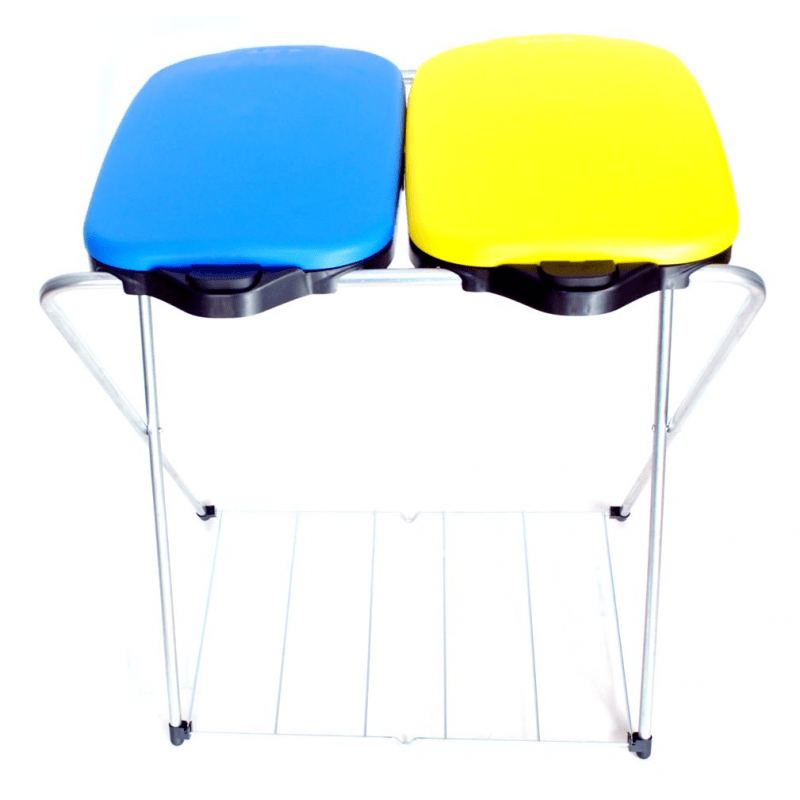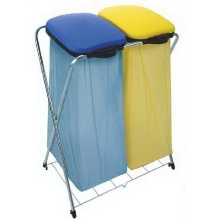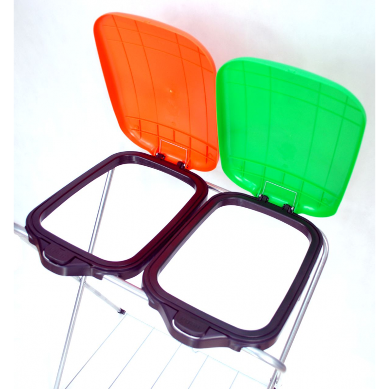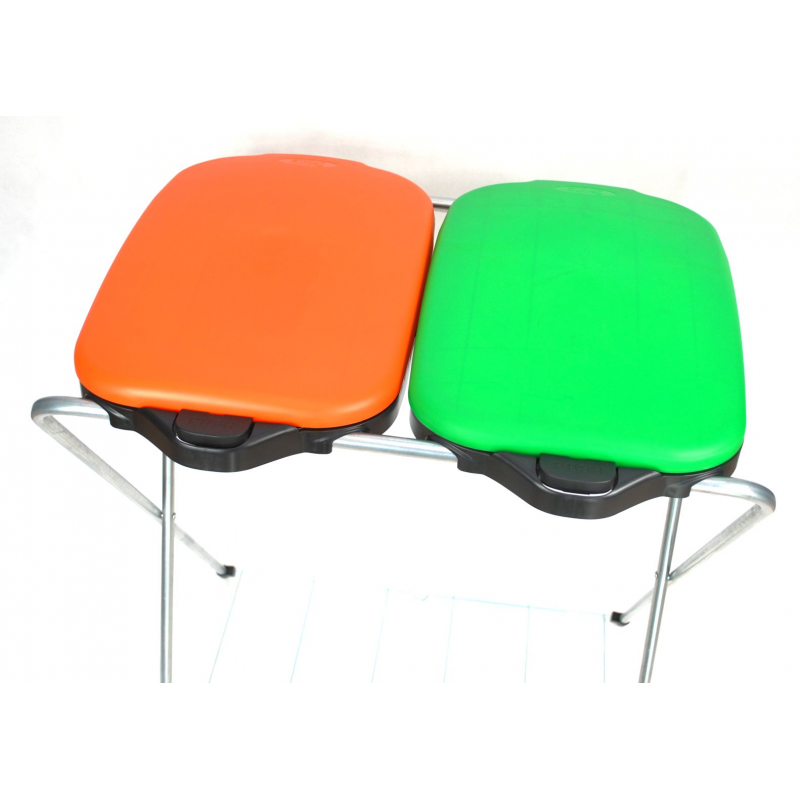 Podwójny stojak na worki wyróżniający się zastosowaniem półautomatycznego systemu podnoszenia klapy uruchamianego poprzez wciśnięcie przycisku oraz podstawy dolnej wzmacniającej konstrukcję oraz zabezpieczającej przed przyleganiem worka do podłoża, które prowadzić może do rozdarcia. Produkt sprawdzi się zarówno w gospodarstwach domowych, jak i biurach jak element przeznaczony do segregacji dwóch rodzajów odpadów. Pojemność łączna 240 litrów pozwola zachować czystość bez konieczności częstej wymiany worków.