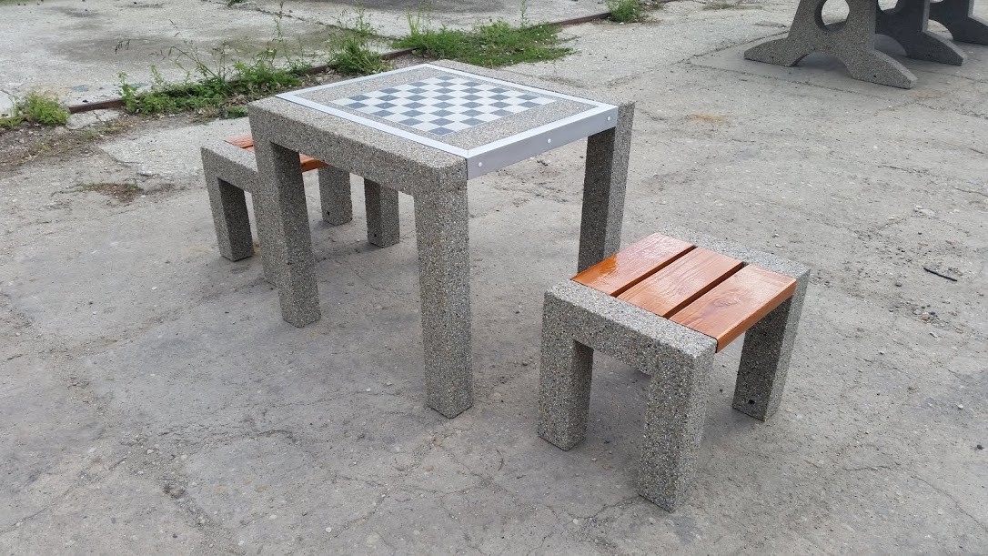 Wykonany z betonu stół do gry w szachy wraz z dwoma siedzeniami. Przeznaczony do umieszczania na zewnątrz .
