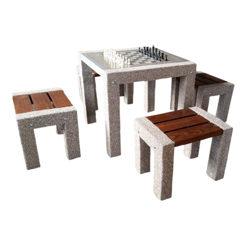 Wykonany z betonu stół do gry w szachy wraz z czterema siedzeniami. Przeznaczony do umieszczania na zewnątrz .