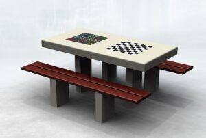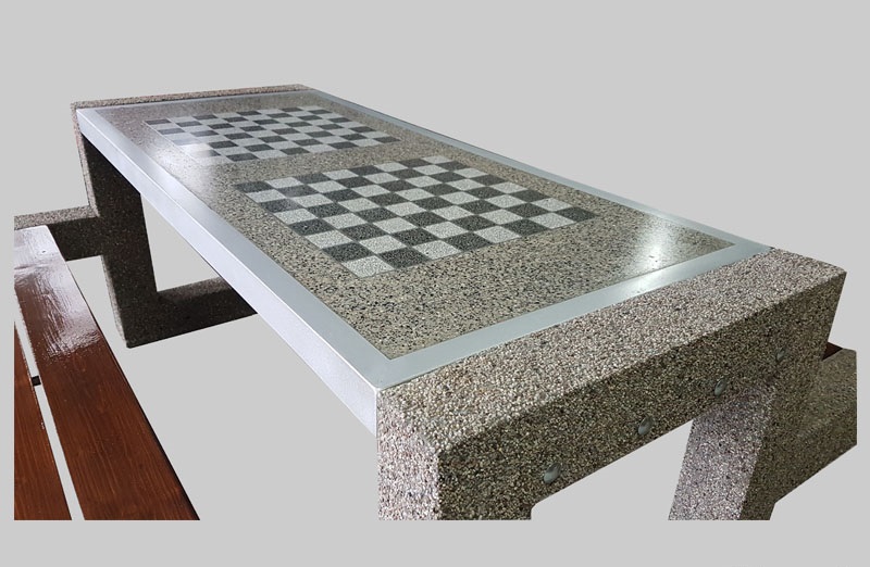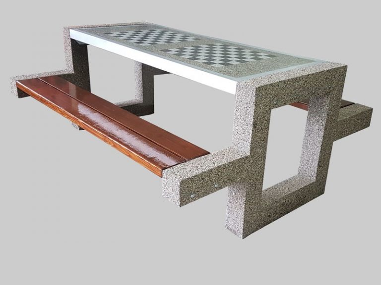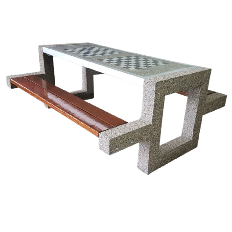 Betonowy stół parkowy z ławeczkami. Stół przeznaczony jest do użytku zewnętrznego, stosowany jest w takich miejscach jak parki, skwery czy też parkingi przy autostradach. Dowolna konfiguracja plansz: do gry w szachy, chińczyka lub do gry w karty.