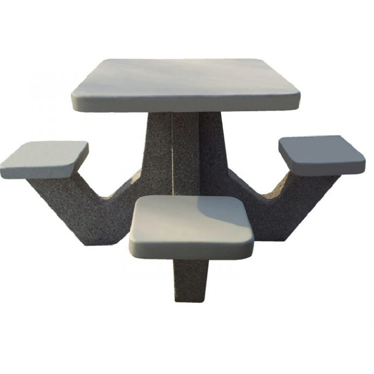 Betonowy stół parkowy z czterema siedzeniami. Tego typu stół stosowany jest w miejscach takich jak skwery, parki oraz na parkingach przy autostradach.