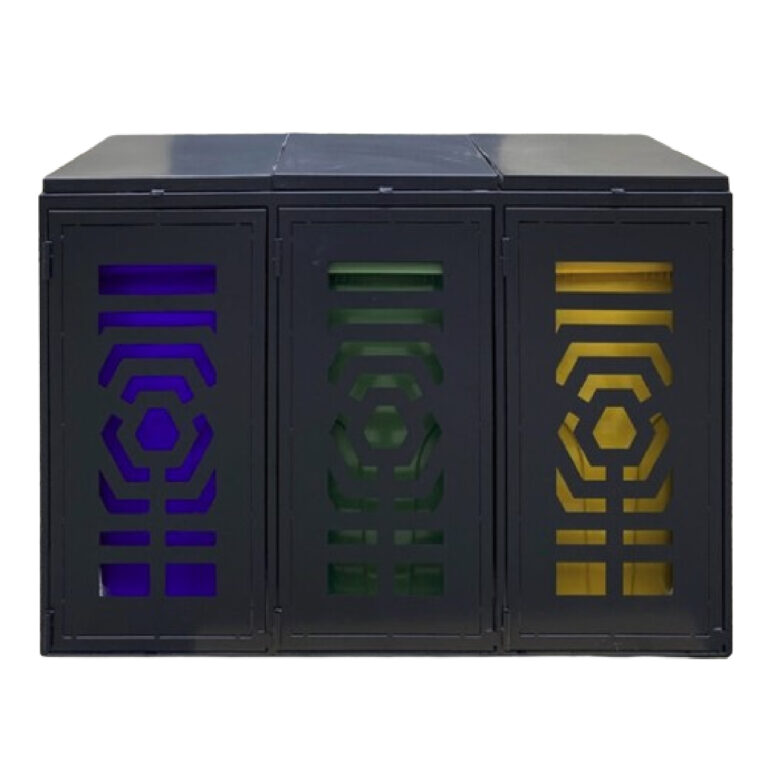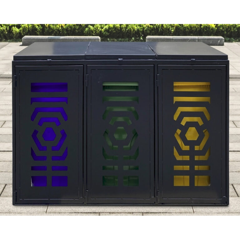 Ta stworzona przez nas wiata śmietnikowa idealnie nadaje się jako zabezpieczenie śmietników oraz jako urozmaicający i upiększający okolicę. Rzadko spotykany wzór, który ukrywa znajdujące się za nim kosze, a jednocześnie umożliwia wgląd w ich kolory zdecydowanie wzmacnia pozytywny odbiór pojemników na śmieci.
