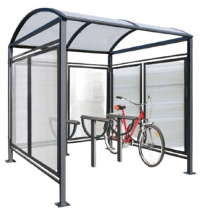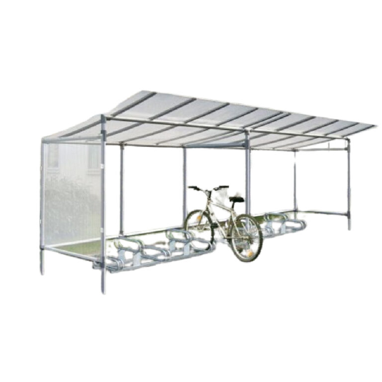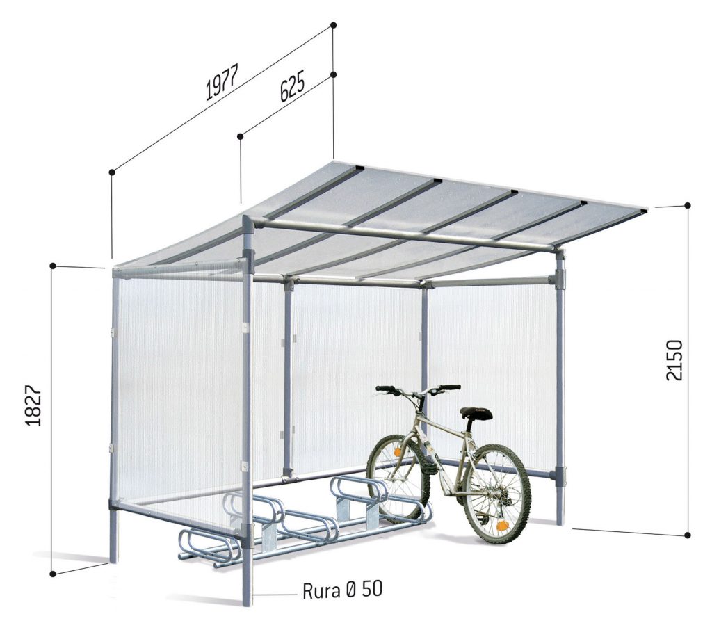 Wiata ochronna dla rowerów. Wiata stworzona by chronić pojazdy przed wszelkimi opadami atmosferycznymi. Do wiaty rowerowej można zamówić stojak rowerowy. Domyślnie pod wiatą może się zmieści maksymalnie 5 rowerów.