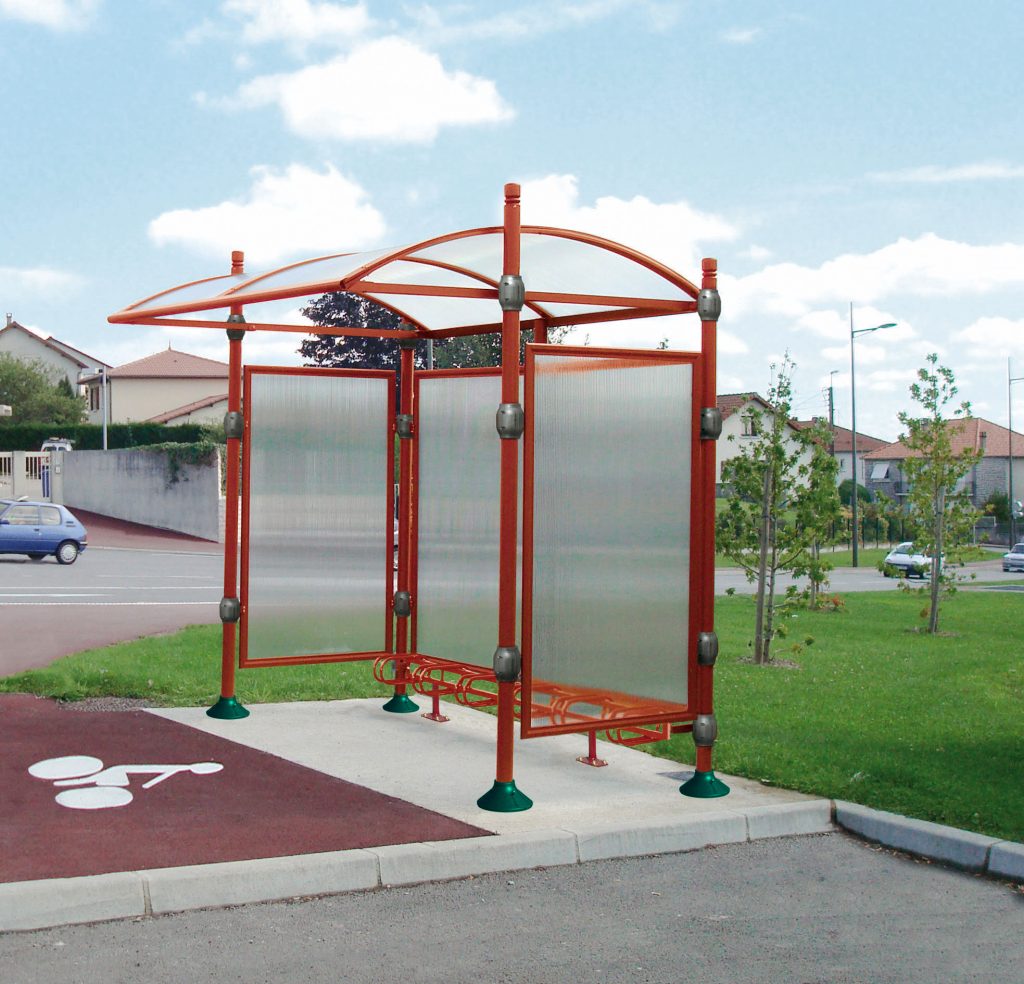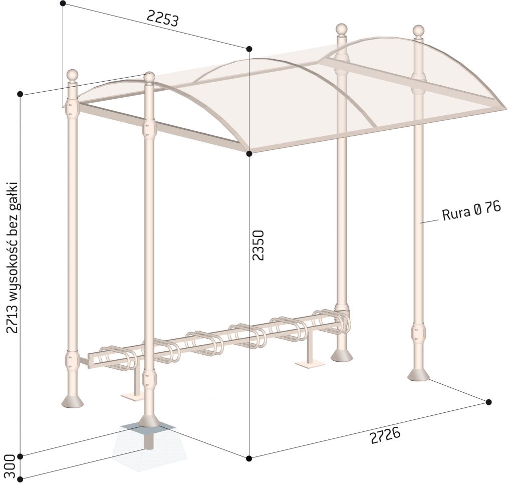 Dobrze prezentująca się wiata zewnętrzna z wytrzymałym daszkiem. Wiata osadzona została na rurach aluminiowych zakończonych gałkami dekoracyjnymi. Wiata rowerowa domyślnie ma 6 miejsc do zaparkowania rowerów, ale może być wydłużona i dostosowana na większą ilość pojazdów.