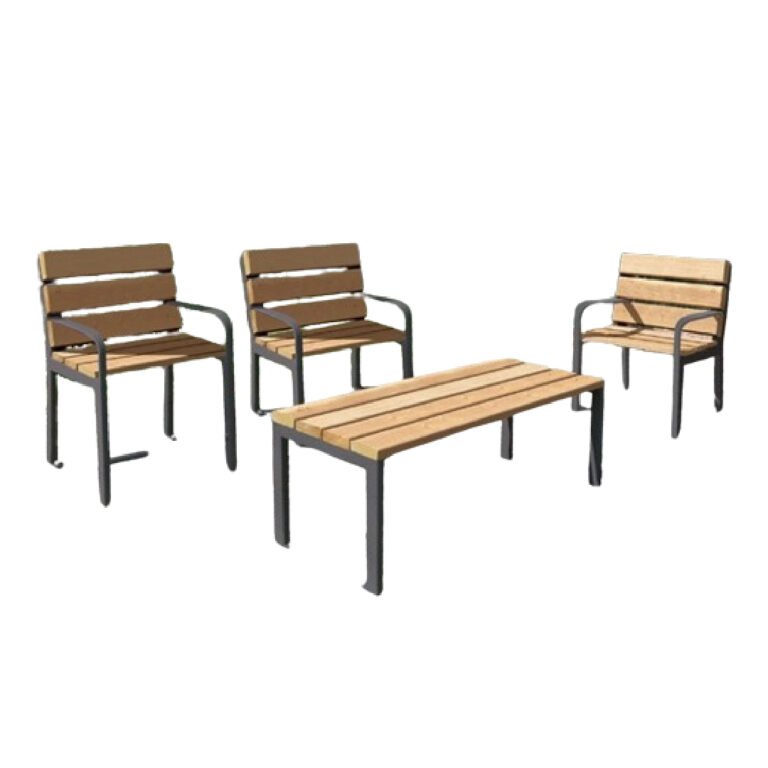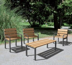 Zestaw ogrodowy w którego skład wchodzą cztery krzesła ogrodowe i stoli. Meble piknikowe wykonane z drewna i ze stalowego stelażu.