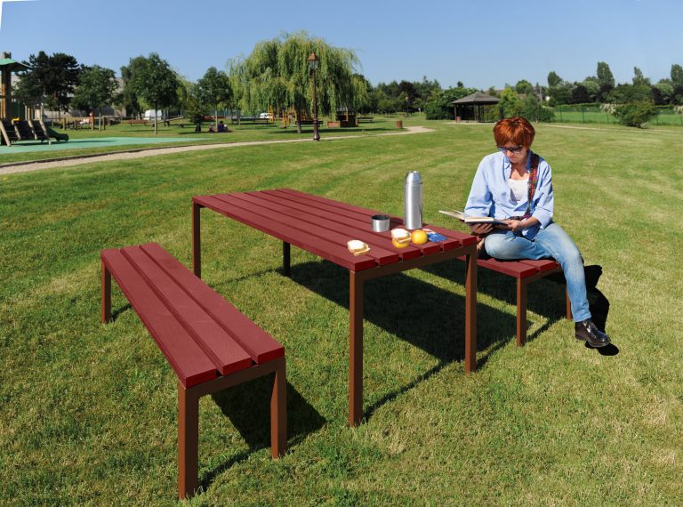Zestaw ogrodowy w którego skład wchodzą dwie ławki i stół ogrodowy. Meble piknikowe wykonane z drewna i ze stalowego stelażu.