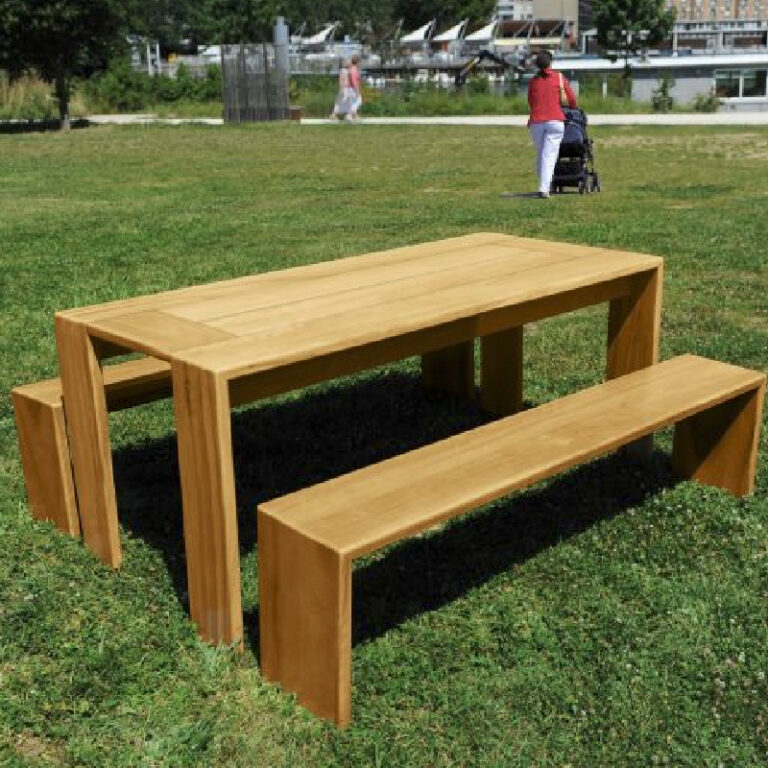 Zestaw ogrodowy o prostej konstrukcji. W zestawie znajduje się stół oraz dwie ławki. Meble ogrodowe wykonane w całości drewna i dostępne w dwóch kolorach.