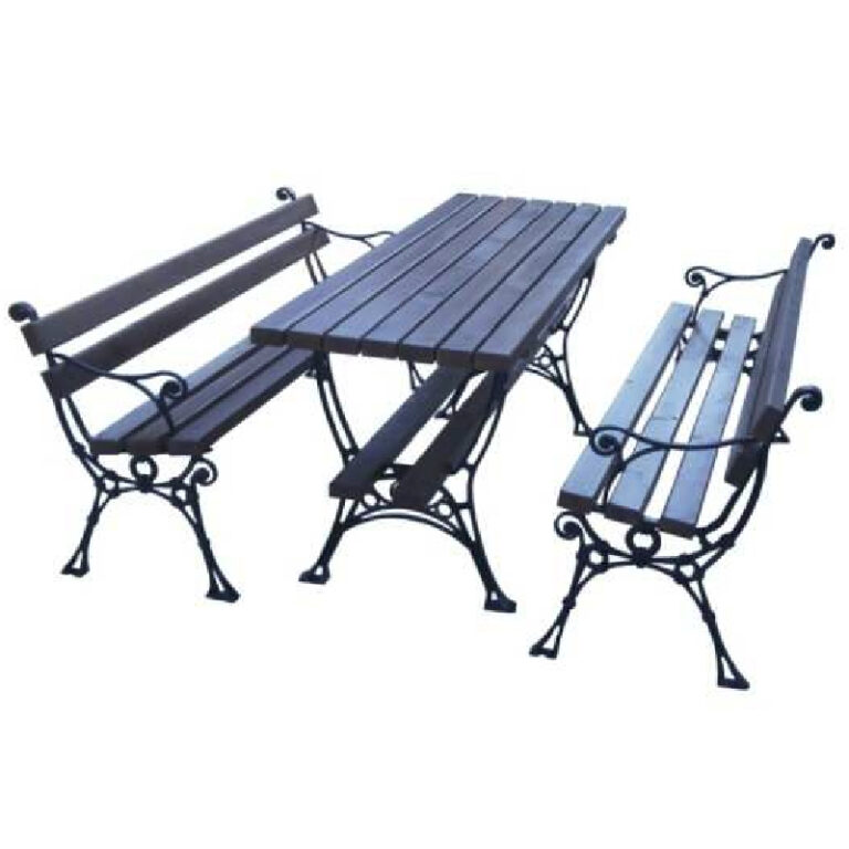 Zestaw ogrodowy składający się z dwóch ławek (z podłokietnikami) oraz stołu, występujący w dwóch długościach: 150 oraz 180 cm.